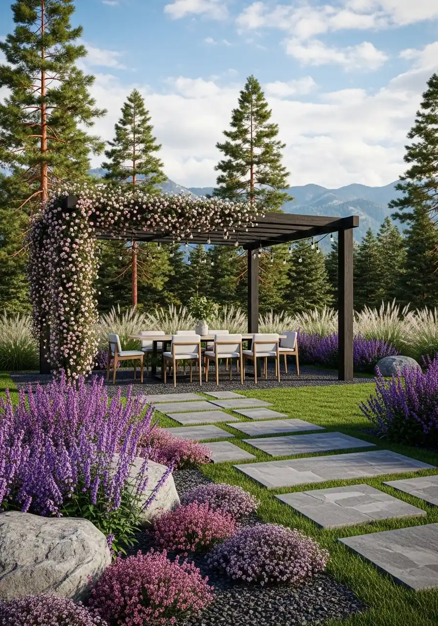 This pergola setup is what I think of when I think “California outdoor living.” A big dining table under a black pergola, lavender tones and soft grasses around it, and wide pavers leading you there like a runway. The mountains in the background make it look huge, but the layout works even if you don’t have a view.