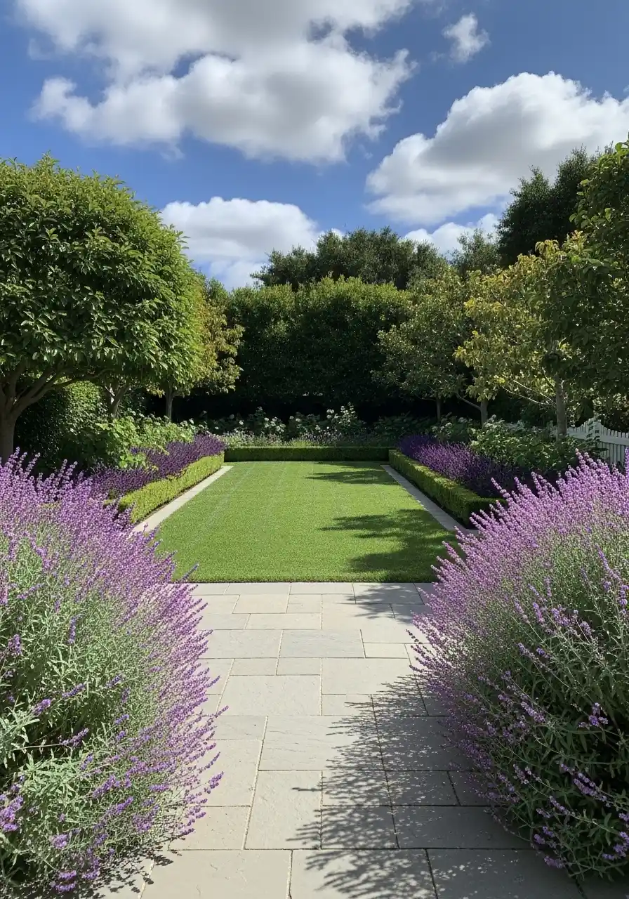 This one is very calm and symmetrical. A straight paver walk leads into a rectangle of lawn, and lavender borders line the sides like soft purple waves. It’s clean, simple, and honestly kind of soothing to look at. It feels like a quiet hotel garden, the kind where you whisper even if nobody told you to.