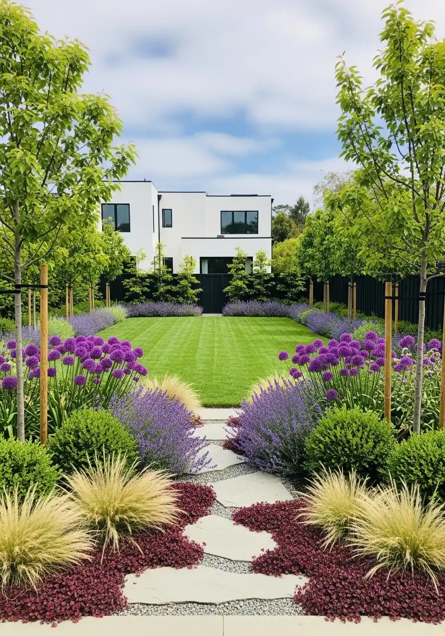 This long view with a modern white house in the distance is so satisfying. The lawn is striped, the path is centered, and purple alliums pop like little lollipops on sticks. There’s also ornamental grass and purple haze plants (lavender or salvia vibes) creating layers. It feels fancy but still soft.