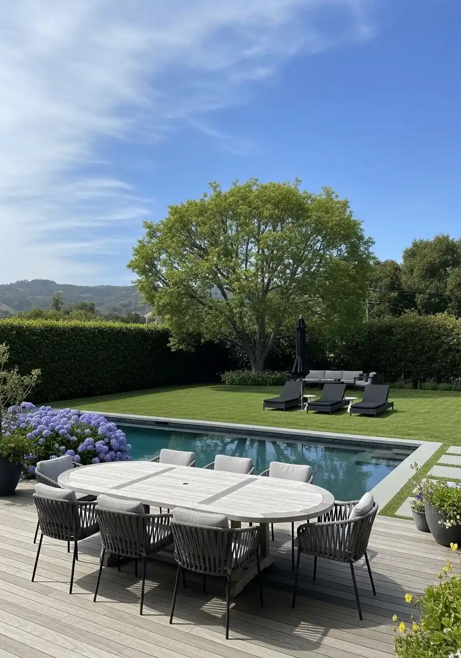 California backyard landscaping with pool dining and a clean hedge backdrop