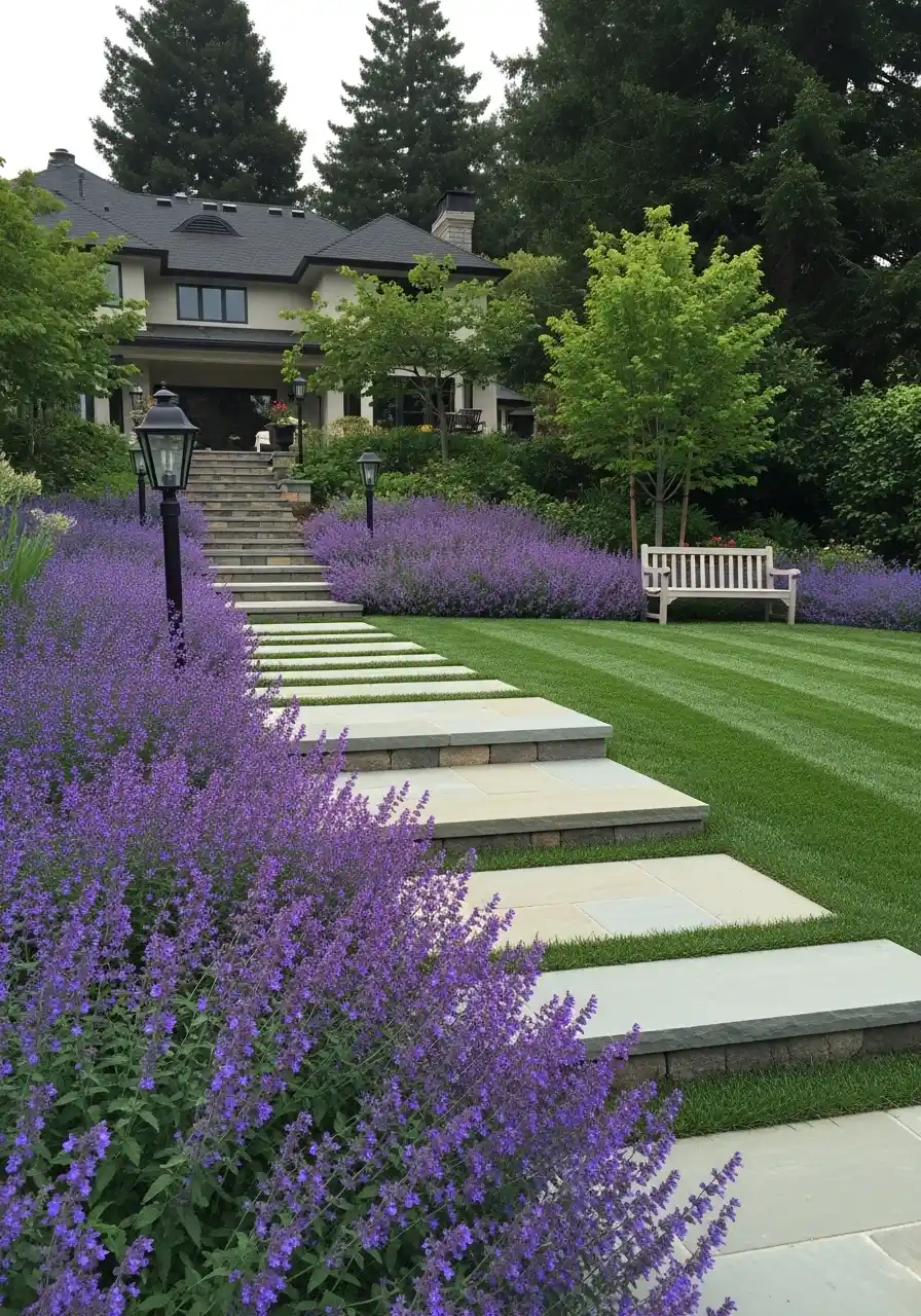 This one is dramatic in a classy way. Big wide steps cut through a lawn, and huge purple plant borders (lavender or salvia-like) make a soft wall on each side. There’s a bench tucked to the side like a quiet resting spot. It feels like a garden you walk through slowly, like you’re supposed to notice things.