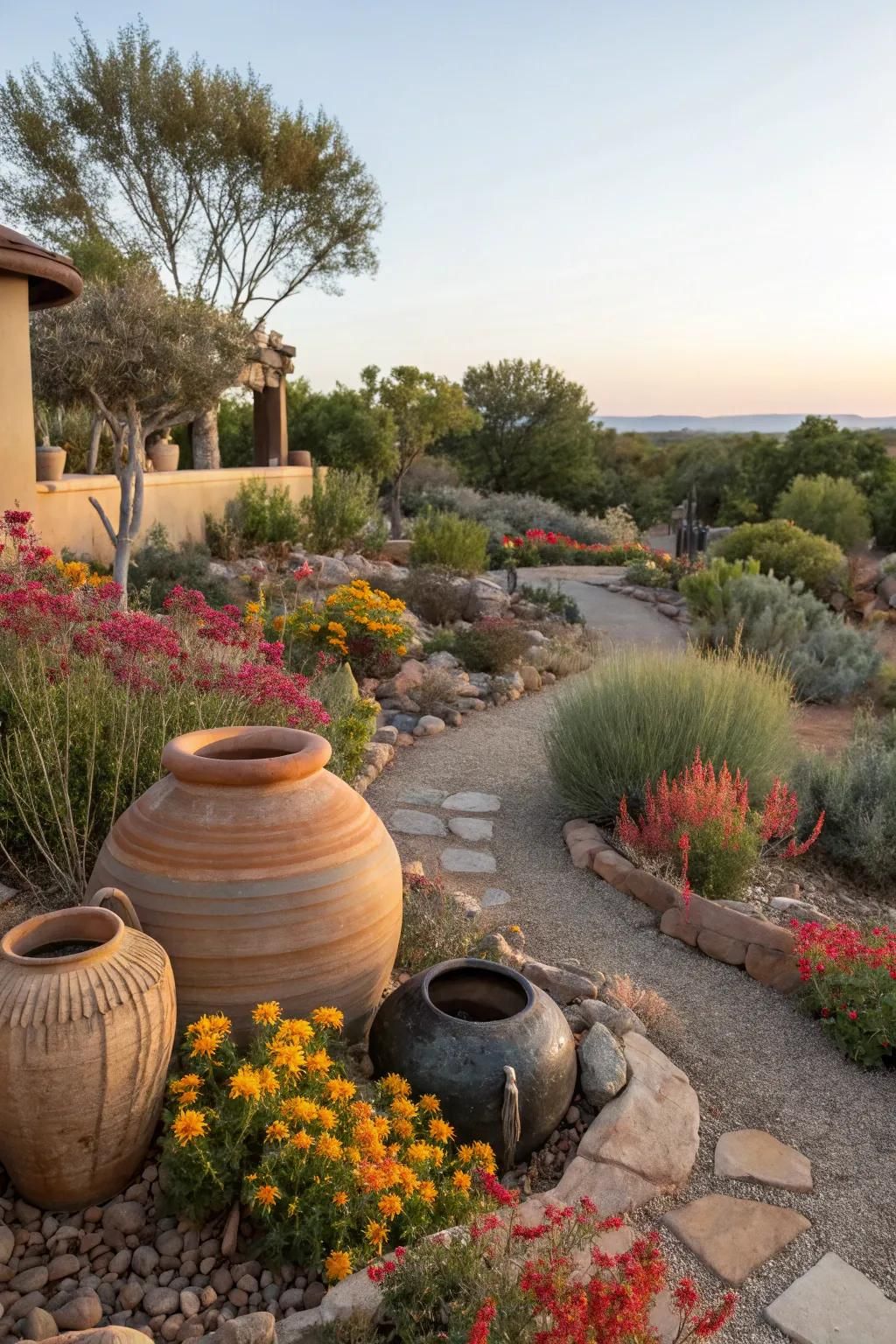 Clay pots + winding path for warm, earthy charm