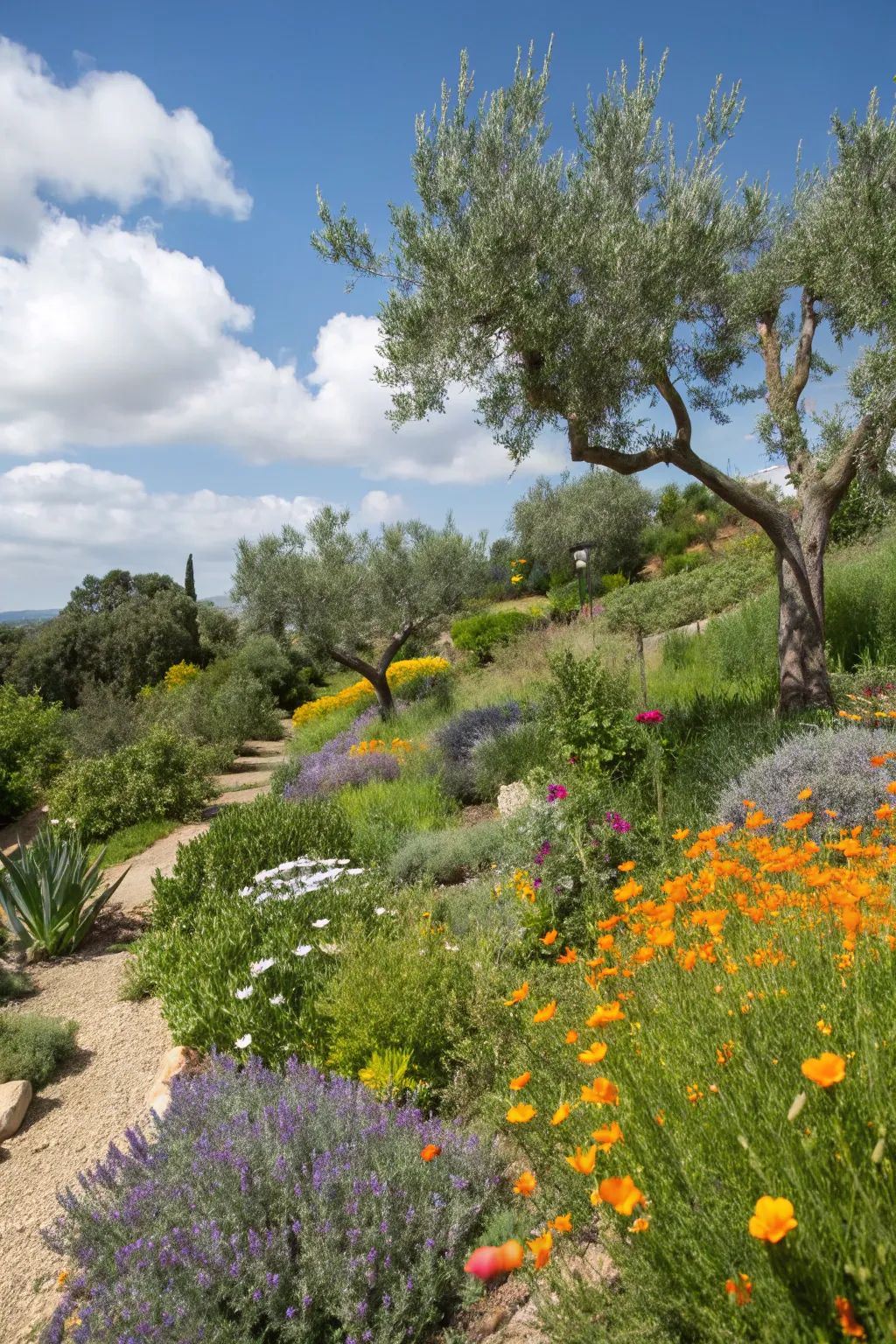 This hillside is honestly dreamy. The silvery olive trees, the soft purple groundcover, and those pops of orange and yellow flowers feel like a painting. I know olives aren’t native, but the look fits the California vibe perfectly, and the plant layering is exactly what people try to copy in a california native landscape.