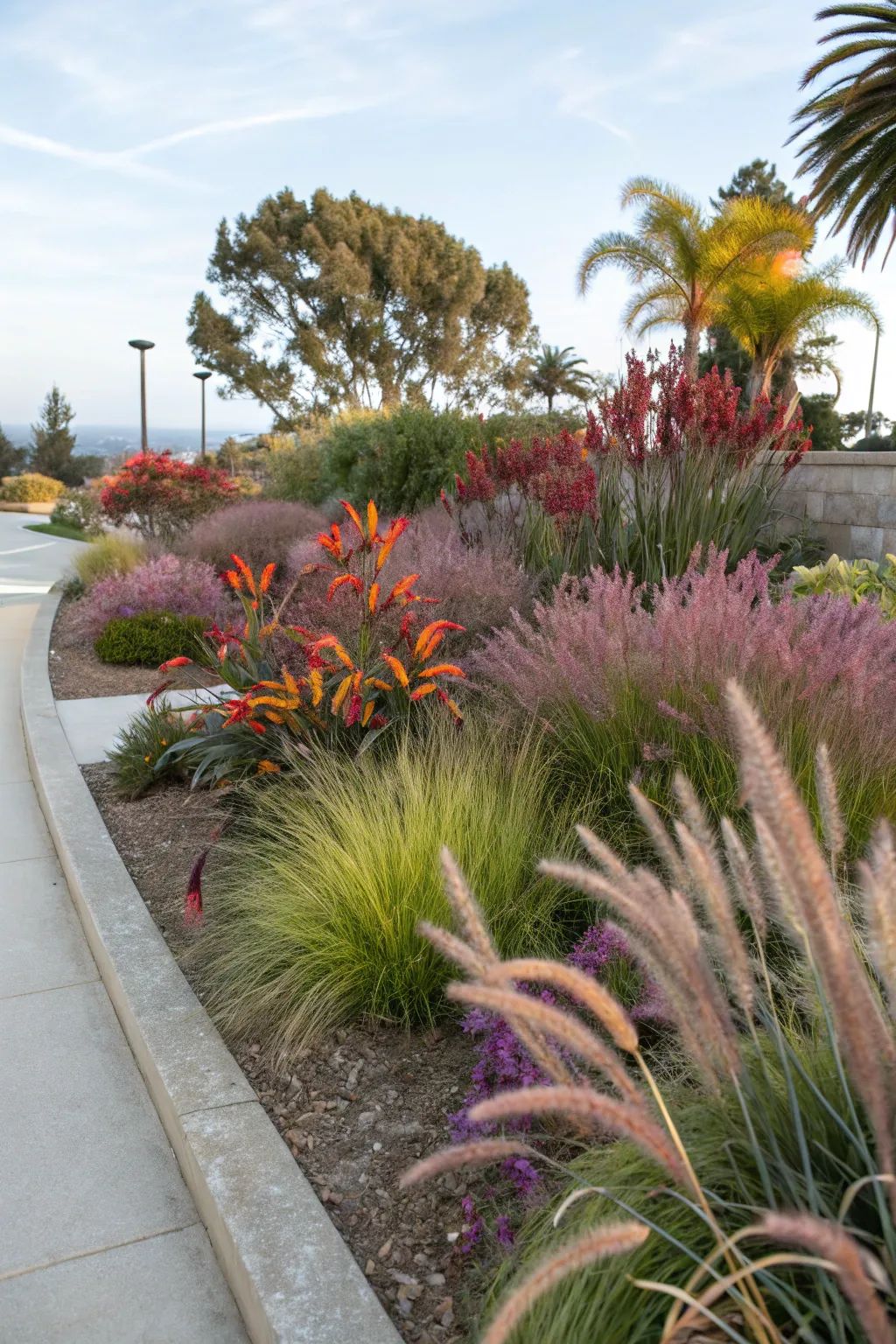 This one is curb appeal with attitude. The grasses are fluffy, the colors are warm and red, and the planting feels intentional without looking stiff. For a california native landscape, curb strips and roadside beds are tricky because they’re hot, windy, and people barely water them. That’s why grasses and tough perennials are such a win.