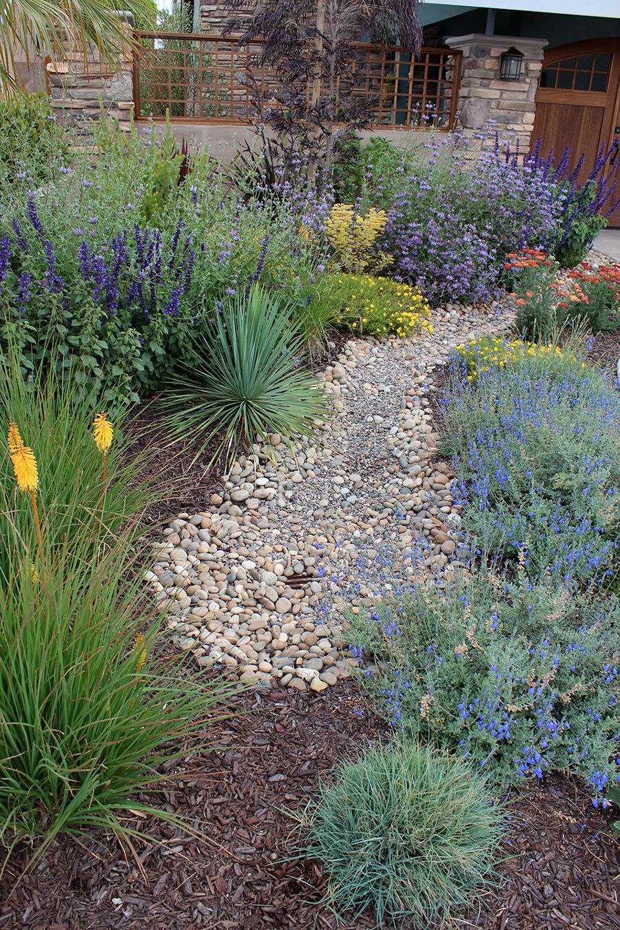 Okay, dry creek beds are not just pretty. They’re problem-solvers. This one winds through the planting like a natural little river, using rounded stones and subtle curves. In a california native landscape, that’s smart because rain comes hard when it comes, then disappears for months. A dry creek helps guide water where you want it.