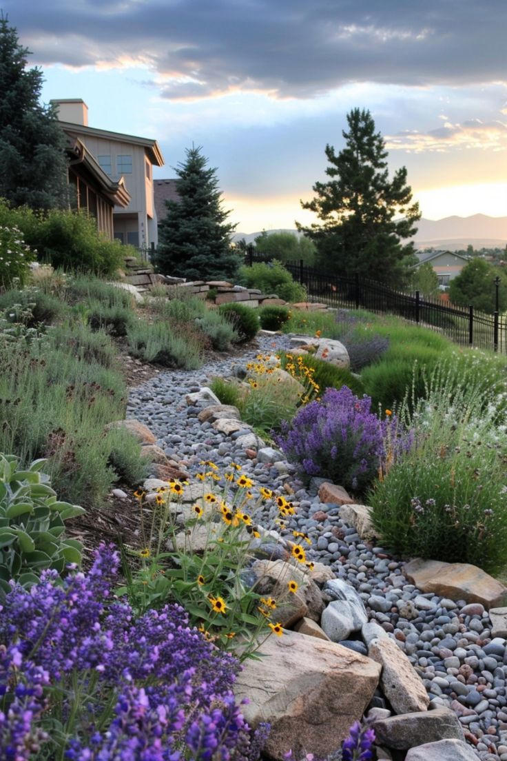 Rock-lined swale with purple and yellow pops
