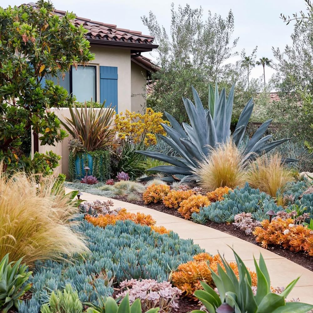 The trick is contrast. Big spiky plant, then softer plants around it. Warm orange low shrubs, then blue-green groundcover, then tufts of grass. It’s like layering outfits, honestly. If everything is spiky, it feels aggressive. If everything is soft, it feels flat.
