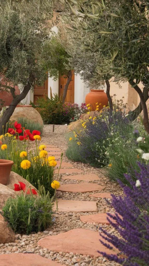 This last one feels intimate, like a secret courtyard. Warm stone, stepping path, silvery trees, and bright red and yellow blooms tucked in. It’s giving Mediterranean California, and it feels cozy in a way that’s hard to explain. A california native landscape can totally borrow Mediterranean cues, because the climate overlaps so much.