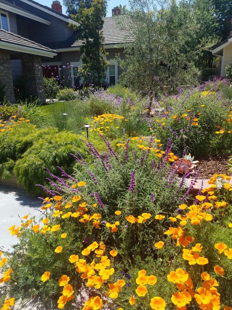 For a california native landscape, this is a classic color combo because orange and purple are opposites, so they pop. The “drifts” of flowers are thick, which is what makes it feel lush instead of patchy. And the path curves gently, so it feels friendly.