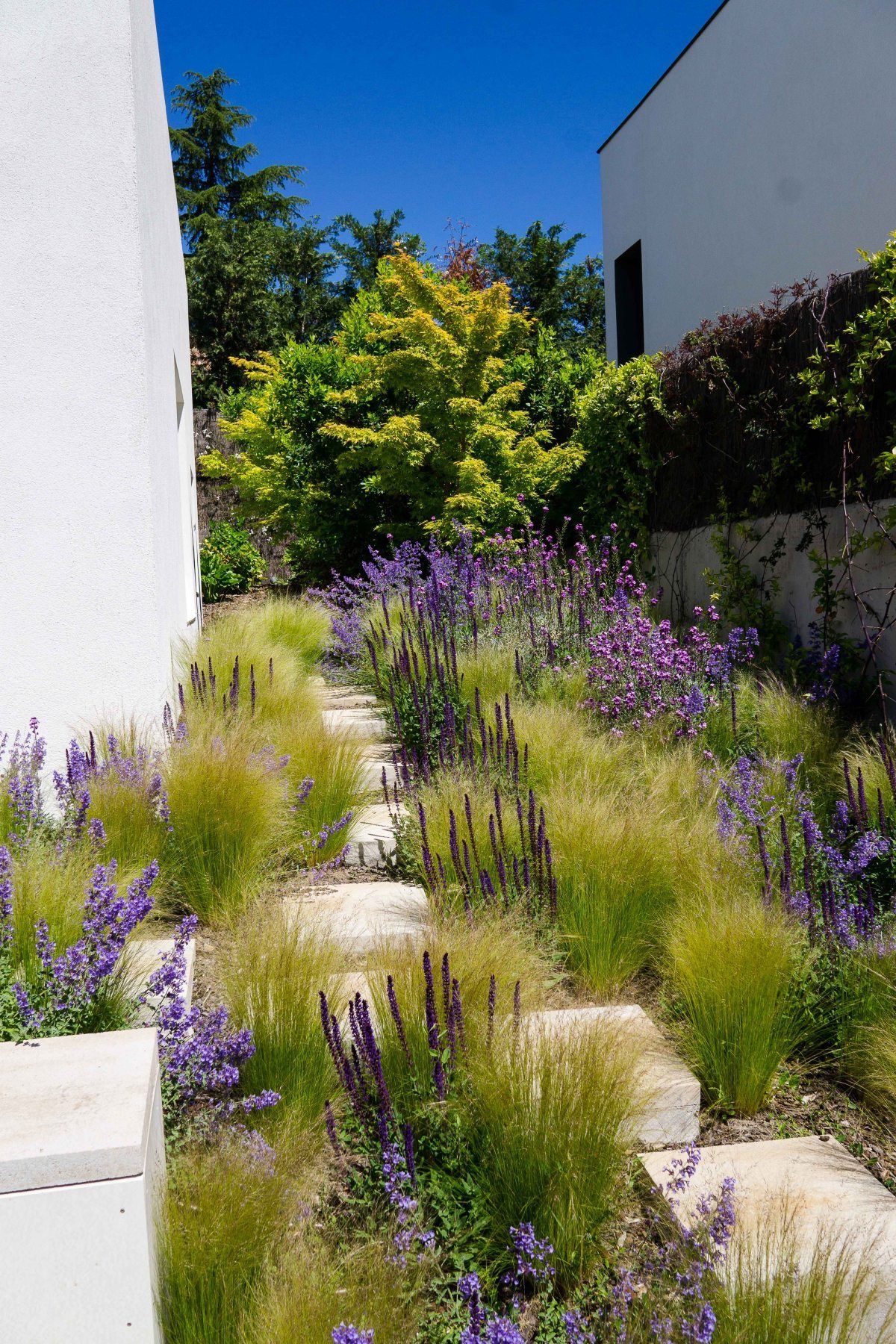 This narrow passage garden is simple and elegant. Concrete stepping slabs run through soft grasses and tall purple flower spikes. The plants are airy and light, and the white walls make everything feel brighter. It’s modern, but not cold.