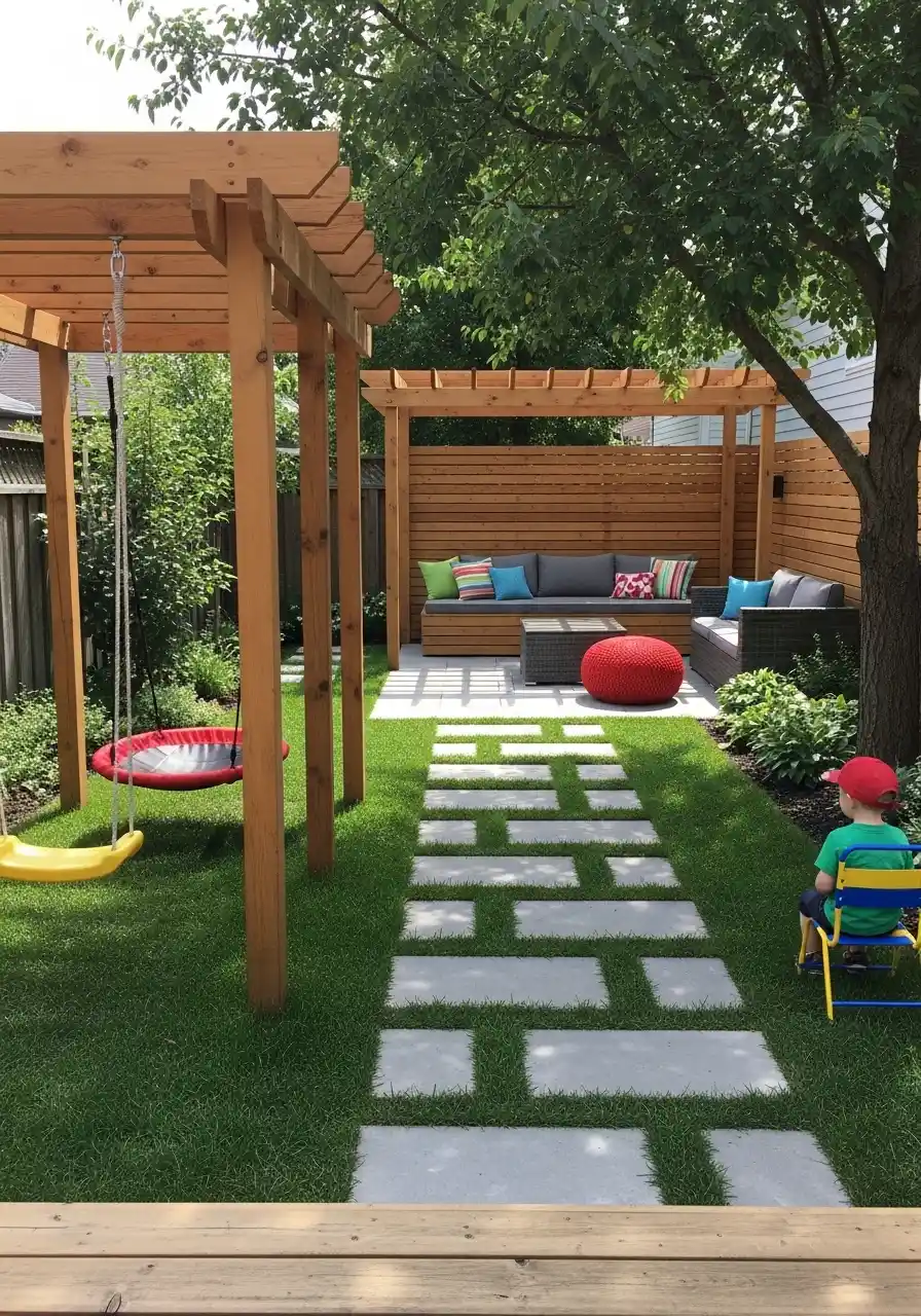 This next yard is like a dream backyard for both kids and dogs. There’s a swing area, a pergola lounge, and a clean paver path with grass between the stones. It feels playful but still grown-up. I like the way the pergolas create “rooms,” so the yard feels bigger than it is.