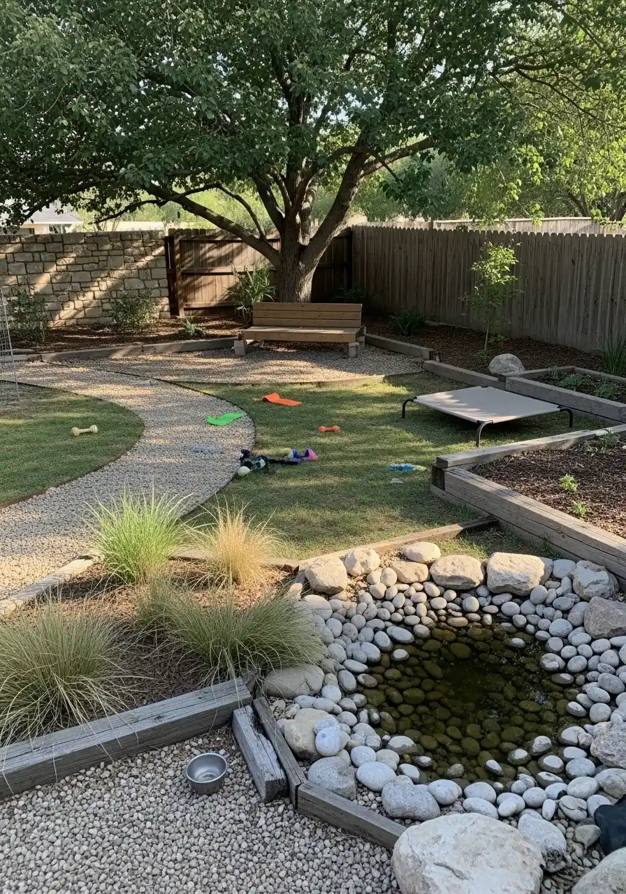 A good trick is keeping the pond edge blocked with big stones, so dogs don’t fall in or drink gross water. Also, mulch around the trees helps keep the dirt from turning into a messy pit. This is strong dog friendly backyard landscaping ideas energy because it has zones: play zone, chill zone, garden zone.