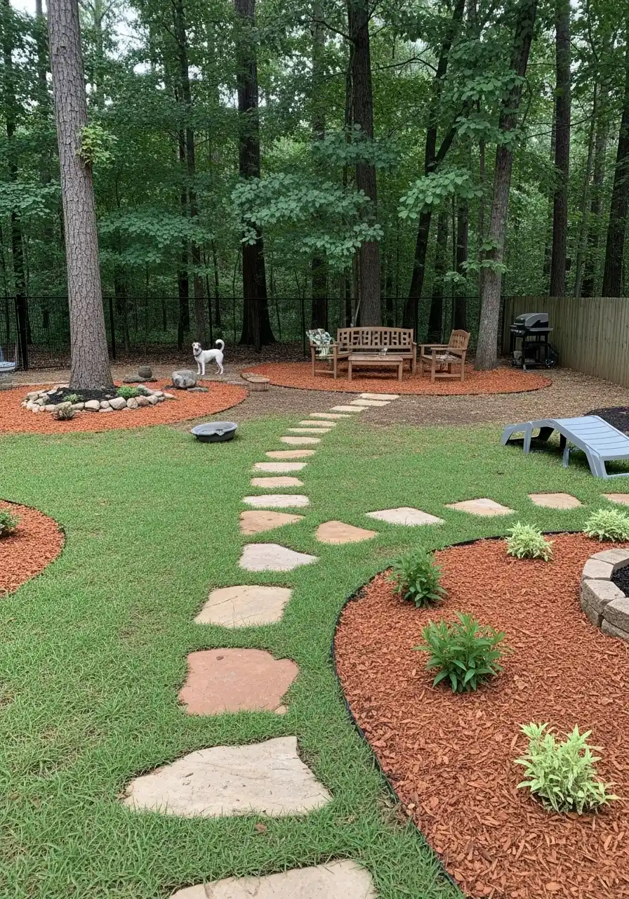 Dog friendly backyard landscaping ideas with stepping stones and mulch islands