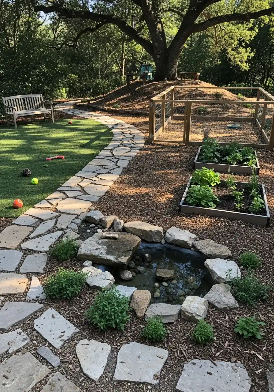 Dog friendly backyard landscaping ideas with raised beds and a tiny creek