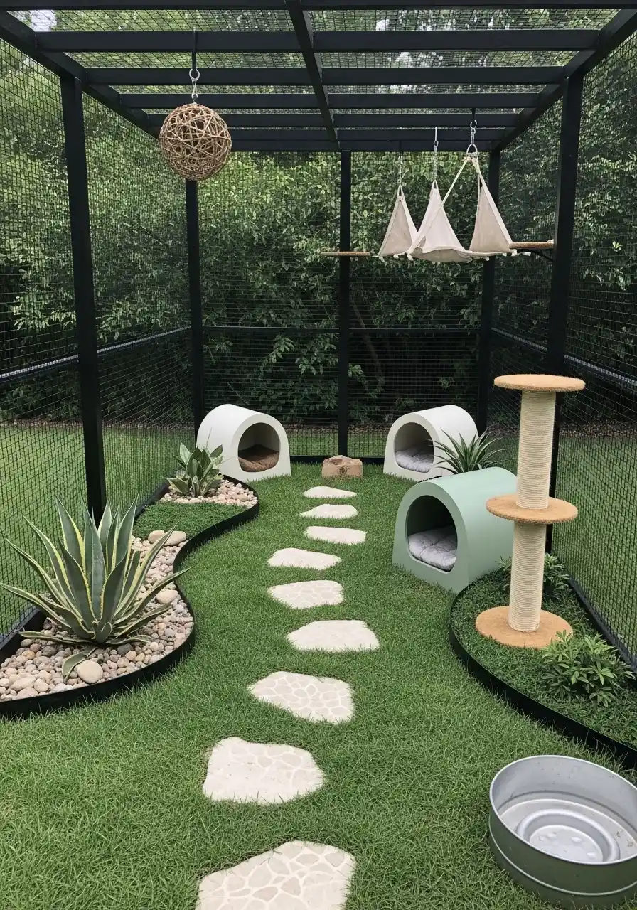 This third space is like a private dog lounge, and I kinda love it. It’s enclosed with mesh walls and a roof frame, so it feels secure. The turf keeps things clean, and those little pebble beds on the sides are smart because they protect the edges. There are even small dog houses and a water bowl ready.