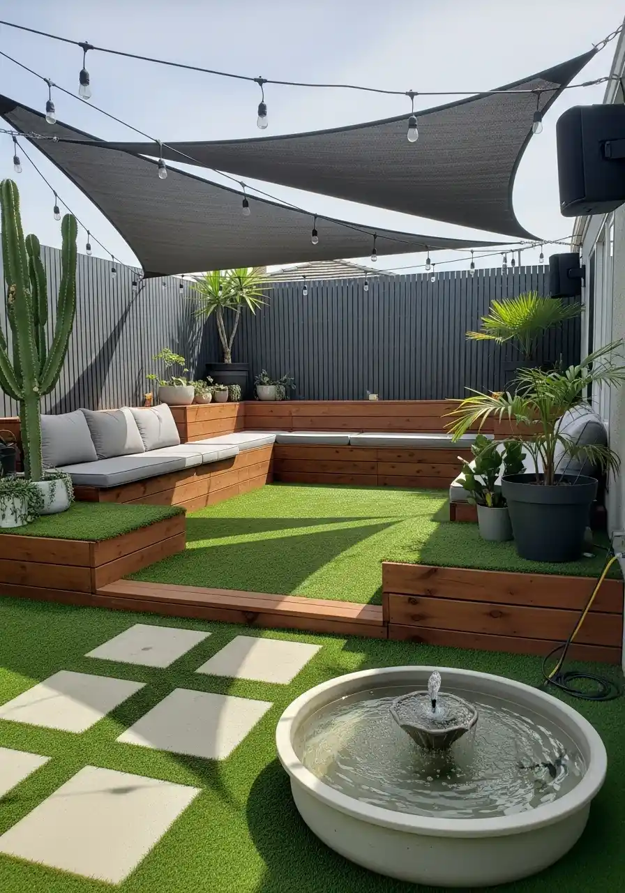 This yard is stylish but still dog-ready. The big shade sails make it feel like a cool outdoor room, and the turf means no muddy paws. The built-in seating is nice because it’s off the ground, and dogs usually like hanging out near their people. That little water feature in the front is calming too, like a mini spa moment.