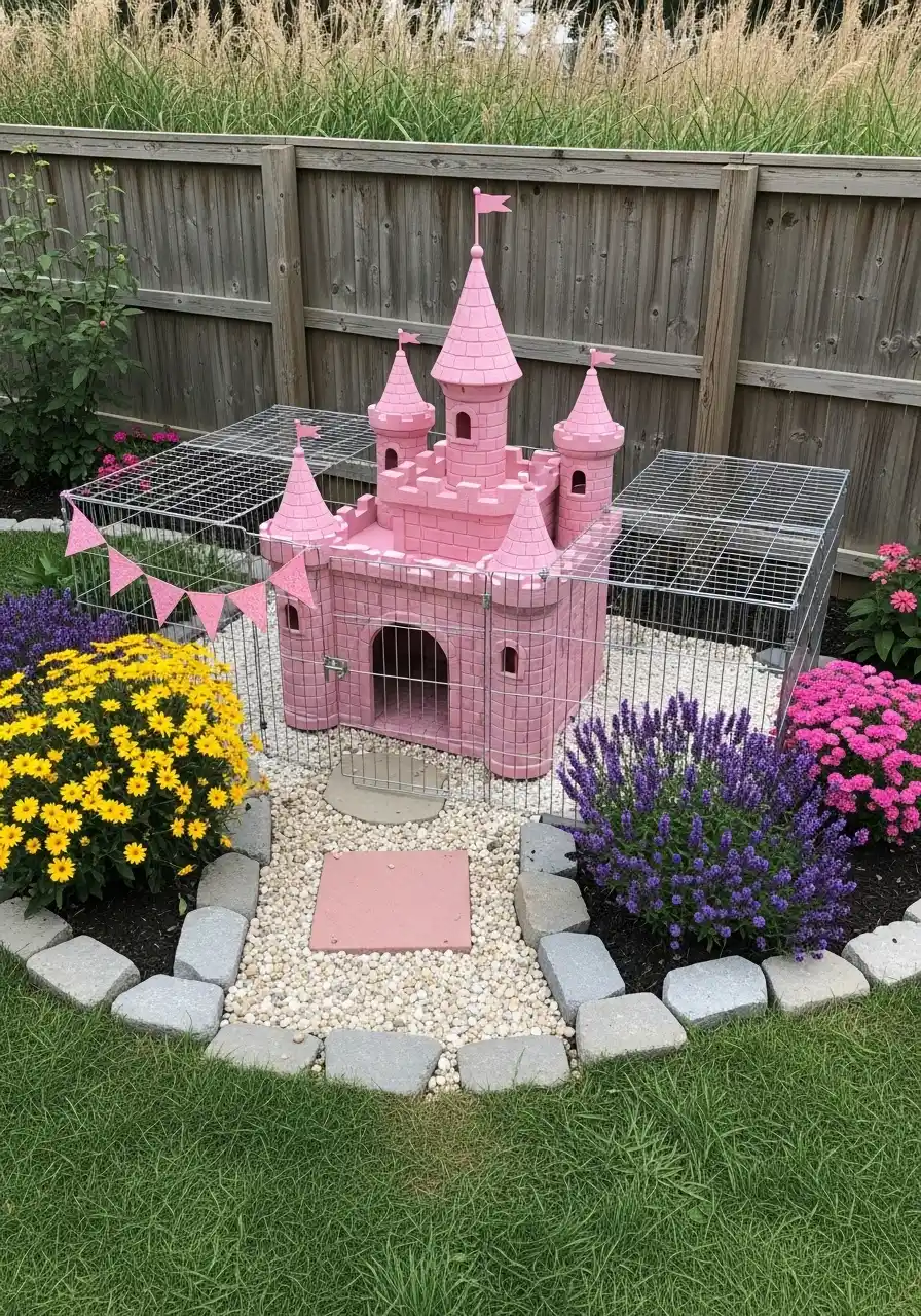 This pink castle setup is honestly adorable. It’s giving “princess vibes” but for a pet space, and I’m not mad about it. The gravel base is clean and drains well, and the flowers around it make it feel intentional, not like you shoved a kennel in the corner.
