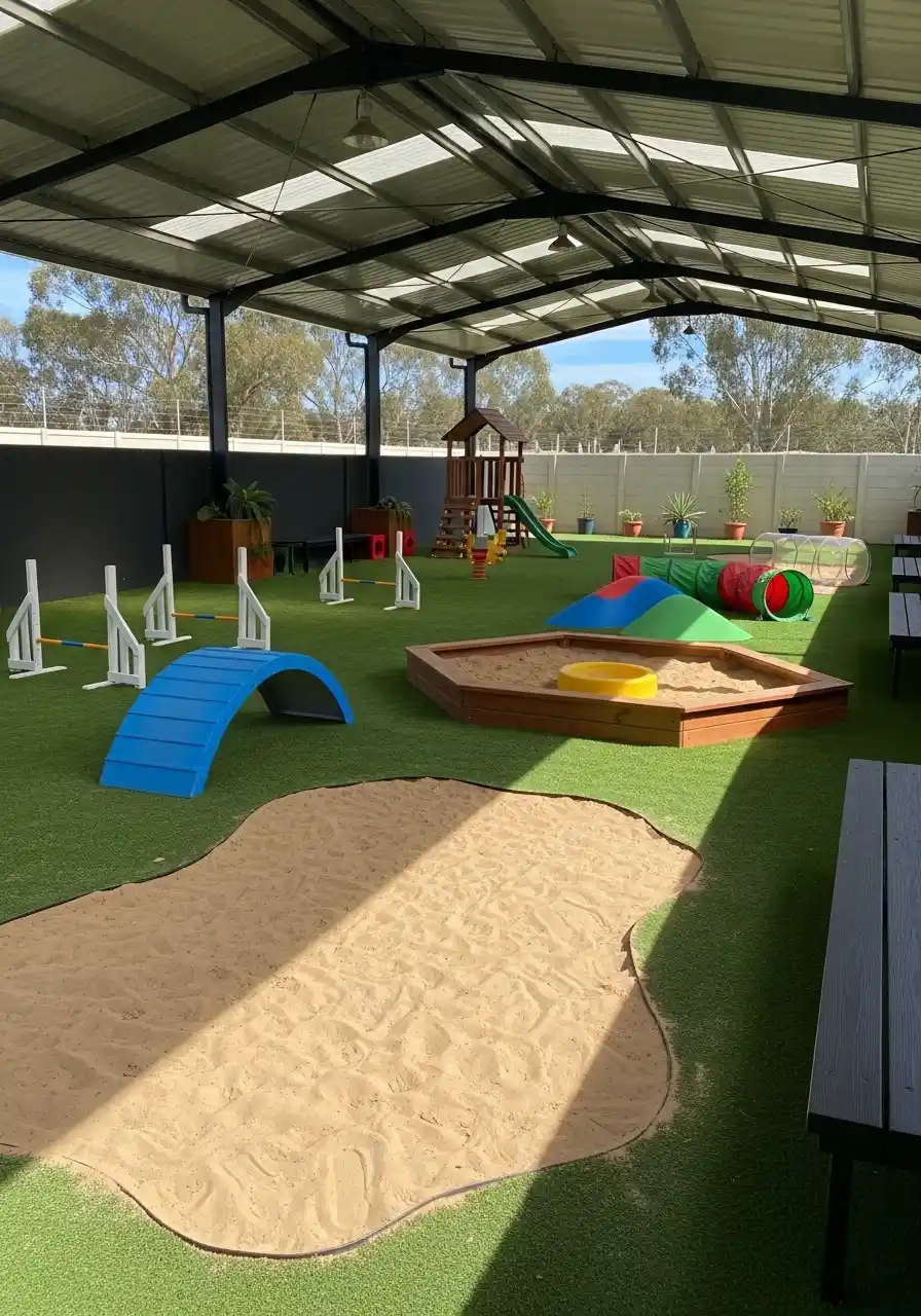 This covered space is like an indoor-outdoor dog park. There’s turf, a big sand area, agility equipment, tunnels, and open space to run. I love the roof because it keeps the yard usable even in bad weather. And the sand pit in the middle gives digging energy somewhere to go.