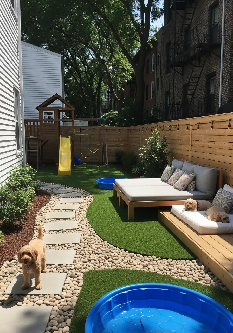 I also like the tiny splash pool idea on the side. A cheap kiddie pool is honestly one of the best dog friendly backyard landscaping ideas, because it saves your house from a wet dog running inside to cool off.