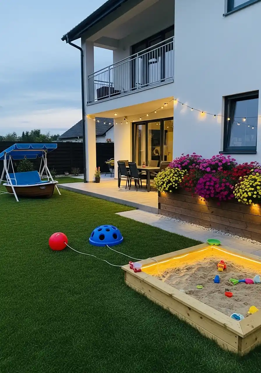 Dog friendly backyard landscaping ideas that mix family lawn with a sandbox play zone