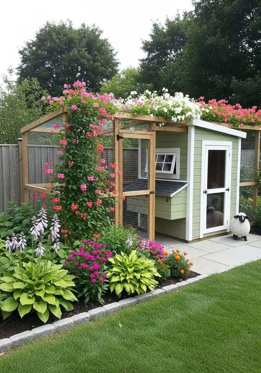 This little backyard house with climbing plants is cute in a cozy way. It looks like a mini cottage for pets, and the flowers on top make it feel fancy. The surrounding garden bed is full and colorful, and the lawn is kept simple so the yard doesn’t feel crowded.