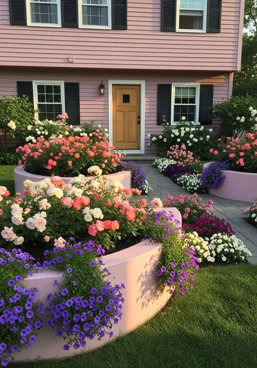 The next one feels like a designer front yard. Curved raised planters in a soft pink tone, overflowing with roses and trailing purple flowers, all in front of a cute pink house. The planters create the border and the structure at the same time, so the planting can be lush without spilling everywhere.