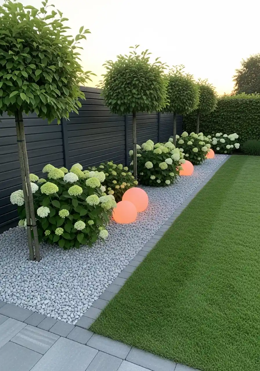 The glowing orbs are such a sneaky trick. At night, the border becomes a light path without needing tall lights that glare in your face. If you want to copy it, keep the border width consistent, like 2–3 feet of gravel, and edge it with pavers or metal edging so the stones don’t creep into the grass. Because they will creep. Gravel is basically a tiny runaway army.