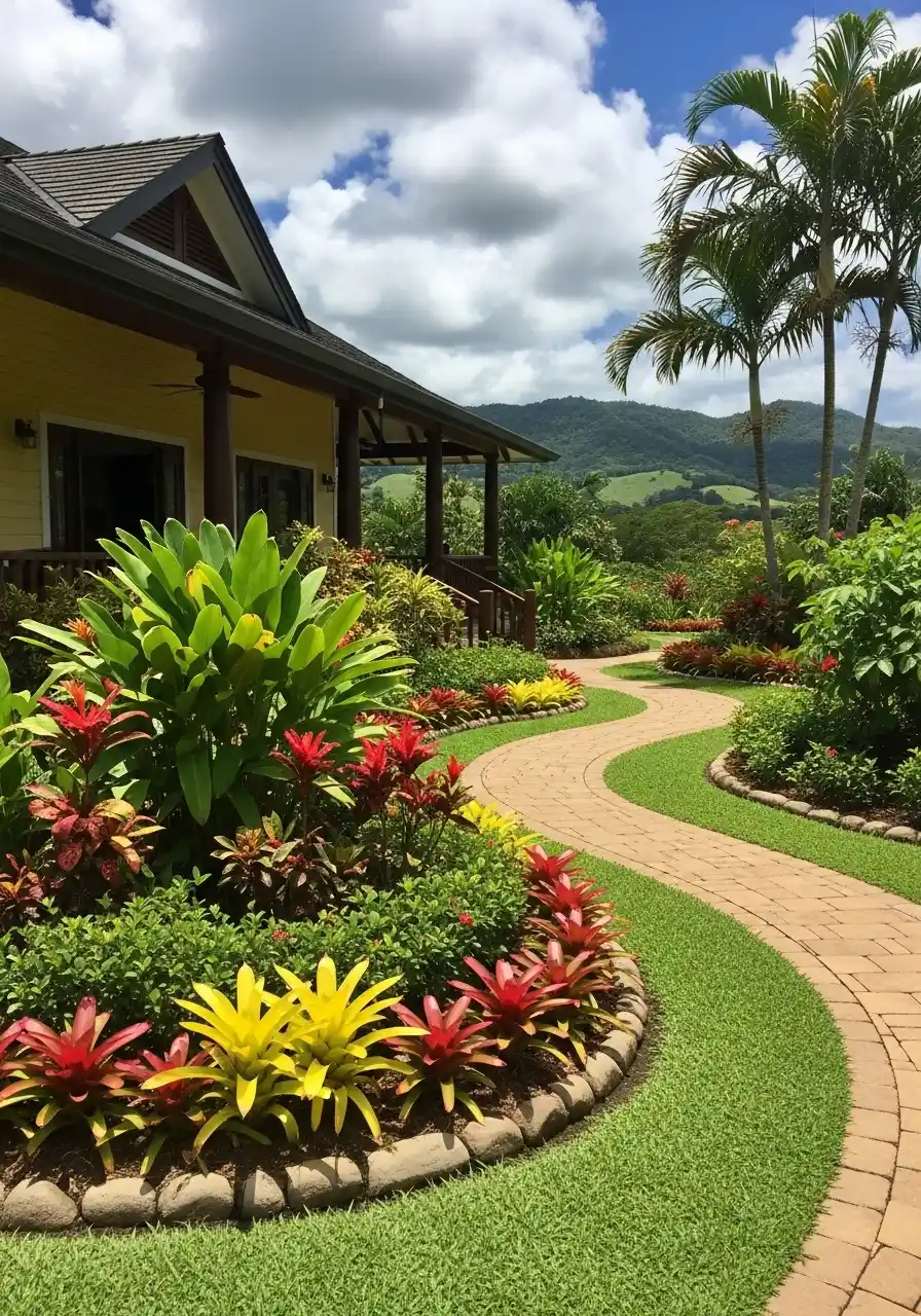 This border is loud in the best way. Bright bromeliads, fat tropical leaves, palms in the back, and the border is made by that curved line of stones along the planting bed. It feels like walking into a vacation spot, even if you’re just going to grab the mail.
