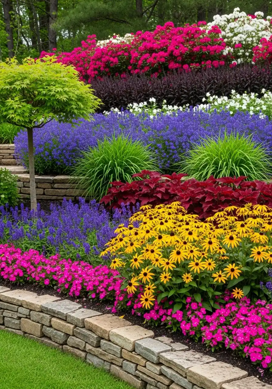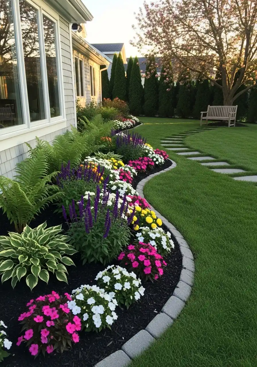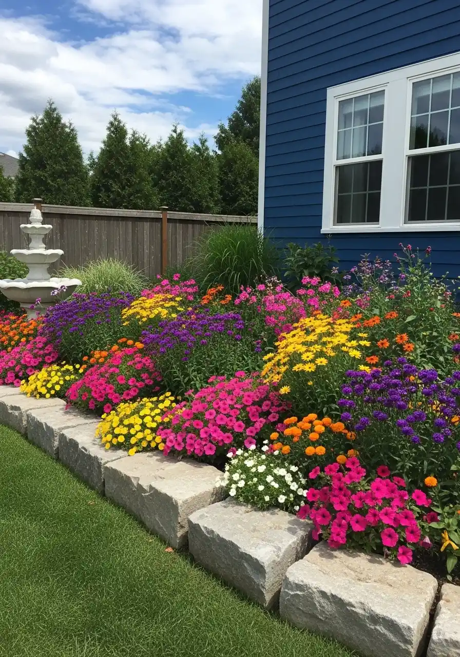 The best part is the stone blocks are tall enough to hold mulch and keep the bed line crisp. If you want to try it, you should pick a few main colors and repeat them. This photo uses lots of colors, but they repeat in clusters so it still looks planned. And the border blocks keep the planting from visually spilling into the lawn.