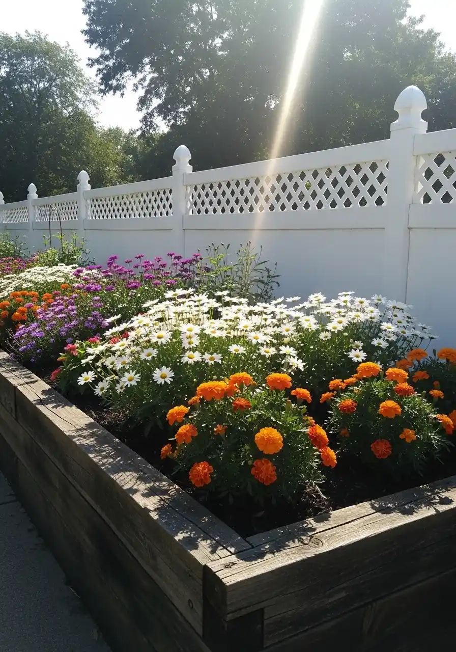 I like raised borders because the soil stays where it’s supposed to stay. Plus, you can control the soil quality, which matters a lot if your ground is sad and compacted. If I was copying this look, I’d do daisies or shasta types for white, then orange marigolds for punch, and mix in purple flowers in the back for contrast. The photo shows that mix and it works because the border stays simple, so the flowers can go wild.