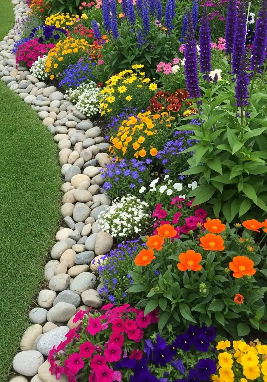 This one is basically the “I want color everywhere” style, and I respect it. The border edge is river rocks, and the plants are planted super full, like a living quilt. Purple spikes, orange blooms, pinks, whites, yellows… it’s a lot, but the rock edging keeps it from looking messy.