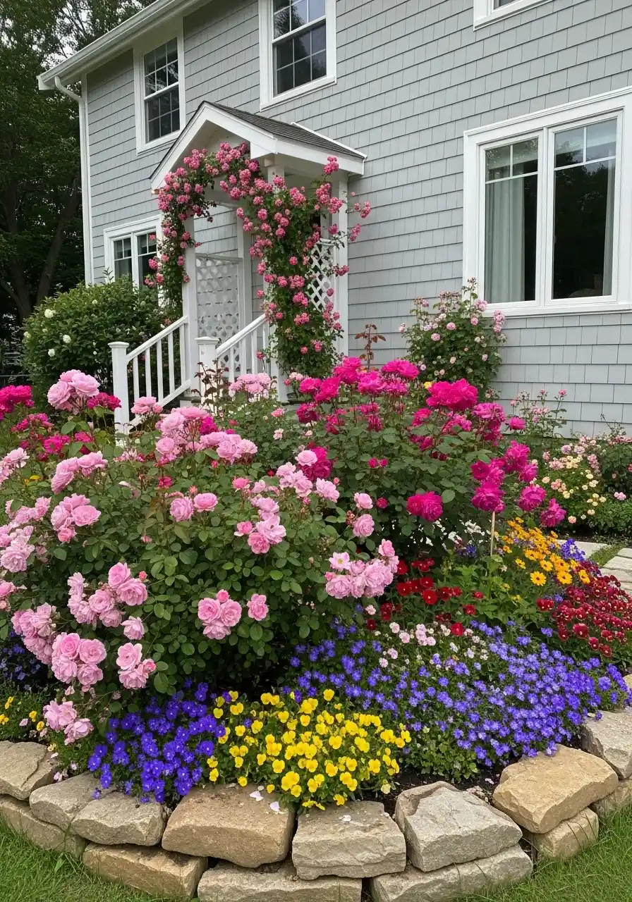 This one is romantic, like it’s trying to make you fall in love with your own front door. The stone border is chunky and natural, and then you’ve got roses climbing up an archway. It’s soft and dramatic at the same time, which is hard to pull off, but this does it.