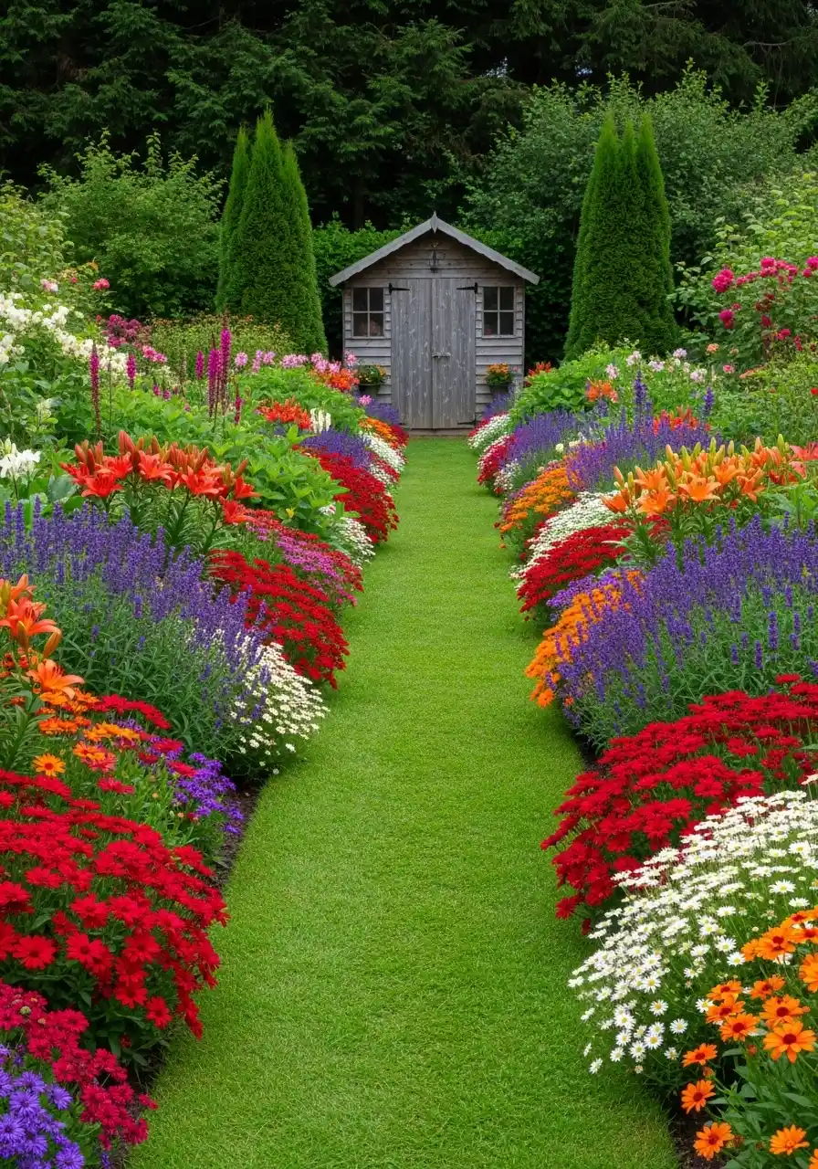 This is the “garden runway” idea and it’s kinda dramatic. A straight green path down the middle, then heavy flower borders on both sides, leading to a cute shed like it’s the final prize. It’s symmetrical, bright, and honestly it would make me want to walk slower just to enjoy it.