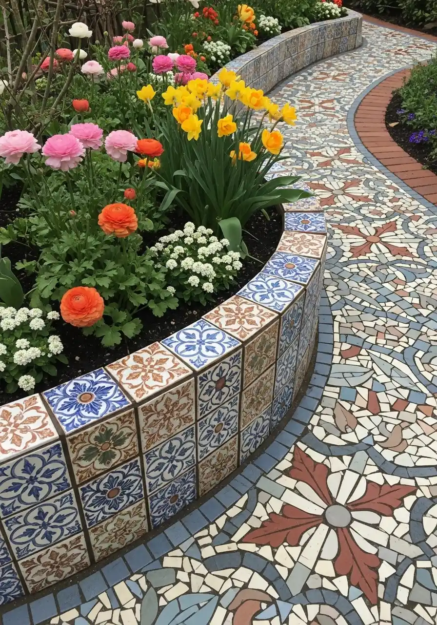 This one made me jealous, not even gonna lie. The border wall is tiled with patterned squares, and the path has that mosaic look too. Then they planted bright stuff like daffodils and ranunculus right up close, so the flowers feel like they’re spilling over the art.