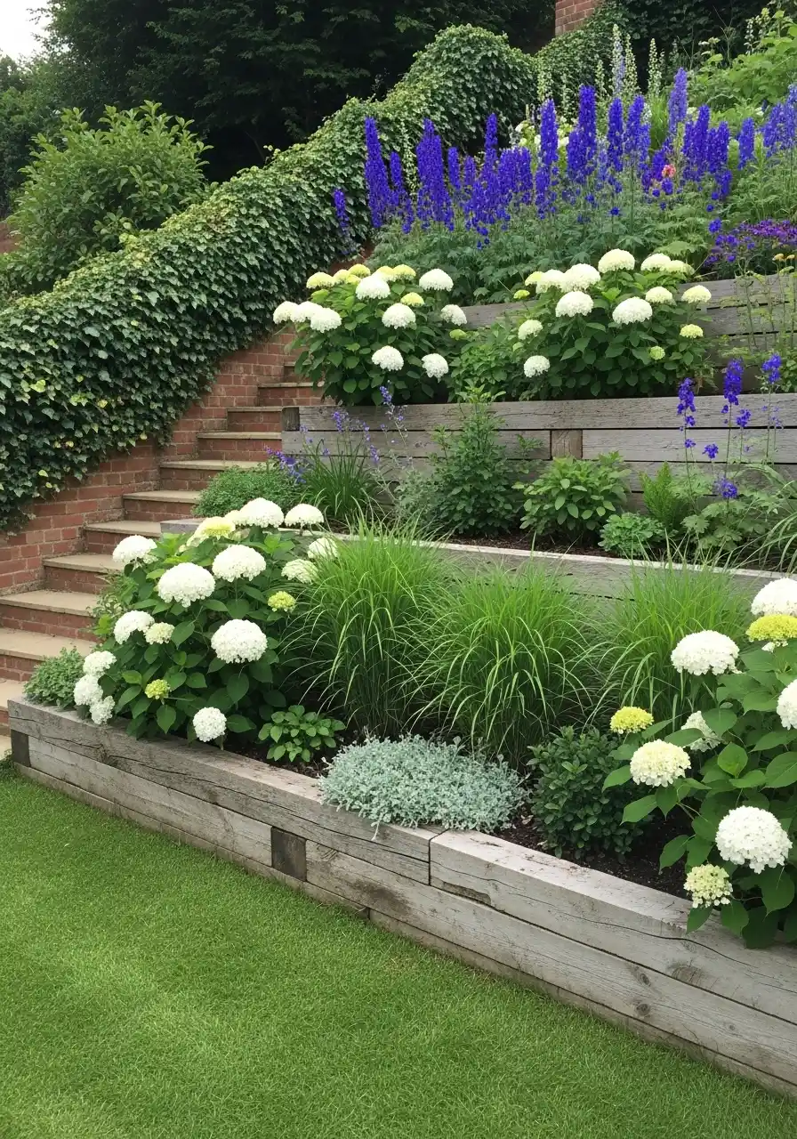 What I’m noticing is the combo: big white hydrangea mounds (they look like little clouds) plus tall blue-purple spikes behind them. That contrast is doing all the work. If you copy this garden bed border idea, place your bigger shrubs along the outer edges of each level, then tuck grasses or low silver plants in the middle so it doesn’t look like one giant blob. Also, leave a tiny lip of timber showing. That little line is what makes it look neat from far away.