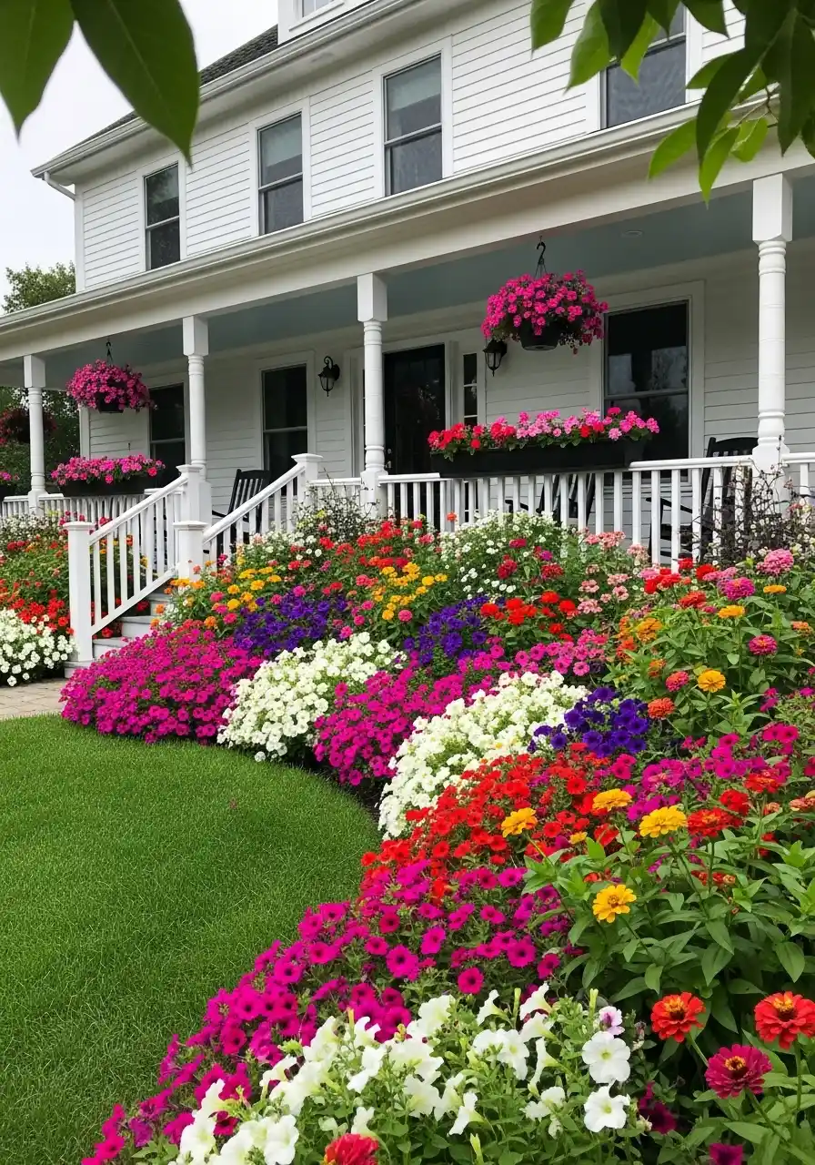 The trick here is layering by height, not by randomness. In the very front, it’s low, mounding flowers that spill outward (petunias, calibrachoa, alyssum, stuff like that). Behind that, mid-height bloomers like zinnias or marigolds keep the color going. Then, closer to the porch, you can sneak in taller fillers so the whole bed doesn’t look squished. One thing I do sometimes is repeat the same 3–4 colors across the whole bed instead of using every color ever. It still looks bold, but not messy-chaos.