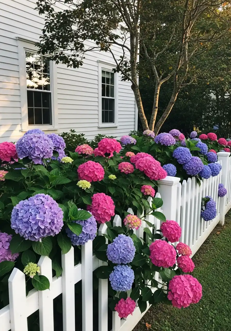 Picket-fence hydrangea border that feels sweet, but still kinda dramatic