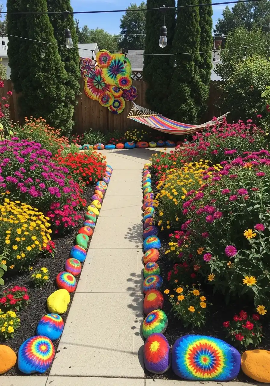 Ok this one is not shy. Painted rocks line the path like a rainbow necklace, with big bright flower mounds on both sides, and a hammock hanging in the back. It feels like a backyard that actually gets used, not just “looked at.”