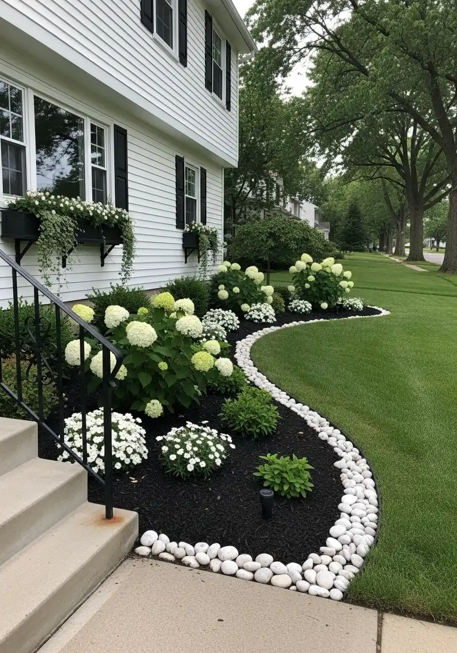 This white pebble edge is the opposite mood from the rainbow rocks, and it’s sooo satisfying. The white stones outline the bed like frosting, and inside you’ve got white blooms and pale hydrangeas against dark mulch. The lawn looks extra green because of that contrast.