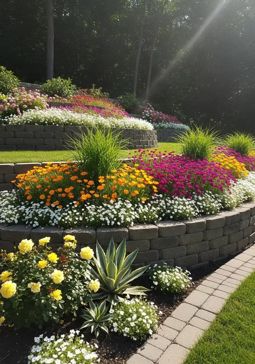 The tiered retaining wall bed is such a smart way to make a slope look intentional. The blocks create levels, and each level is planted with bright groundcovers and small flowers, plus a few taller grasses popping up. It turns “awkward hill” into “wow, that’s a feature.”