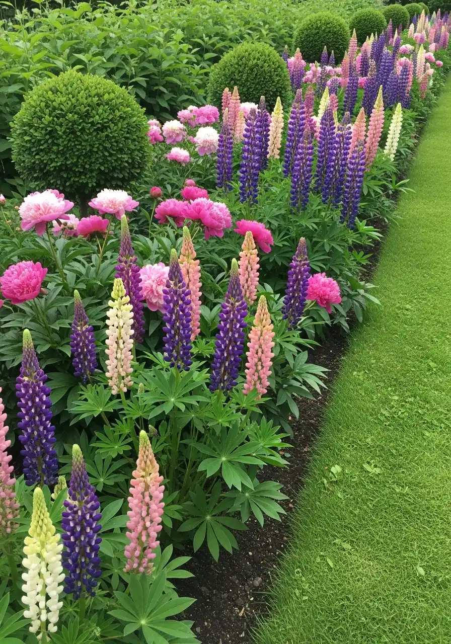 Garden bed border ideas with lupines and peonies for that cottage feel