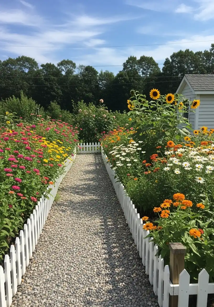 Garden border fence ideas with a sidewalk edge and thick zinnia rows