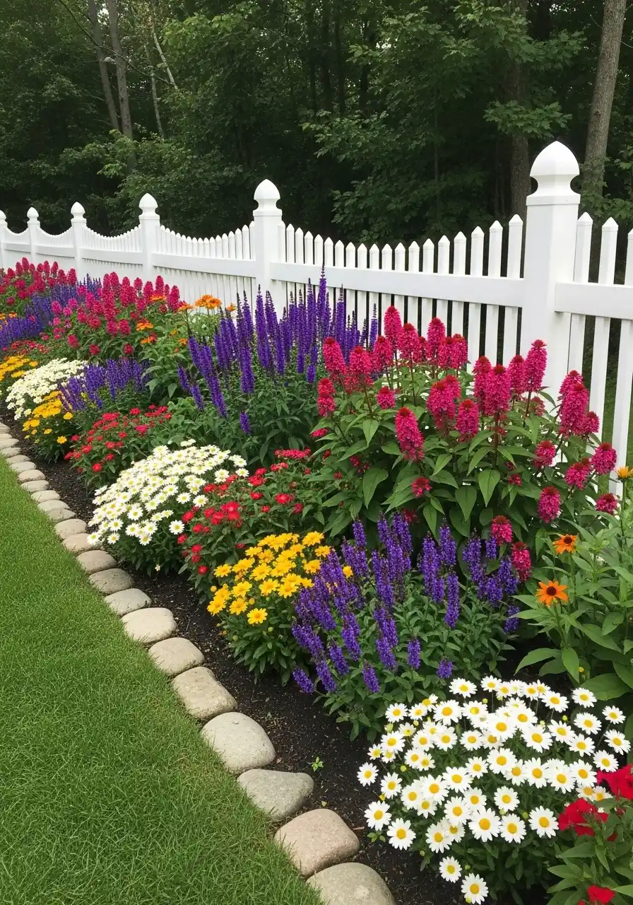 If you want garden border fence ideas in this style, use repeating plant groups. Like, repeat purple salvia in a few spots, repeat daisies in a few spots, repeat red flowers in a few spots. Repetition makes it look planned. When you do one of each plant, it turns into a plant buffet, and it’s confusing.
