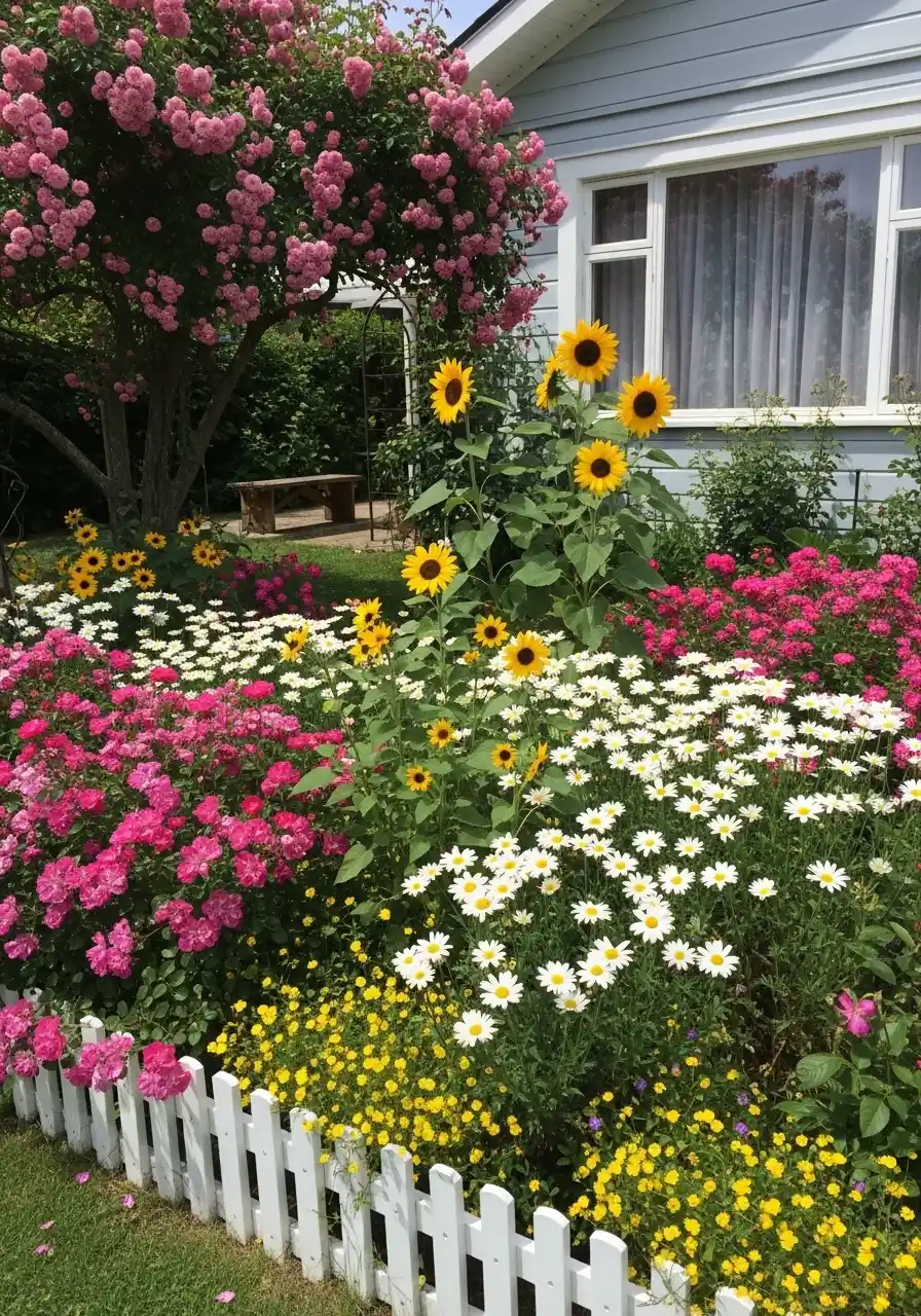 This one feels like a happy explosion. Sunflowers standing tall, white daisies spread wide, pink flowers spilling near the edge. And that small white fence is like a little “don’t cross” sign for the plants. It’s playful and bright, like a garden that doesn’t take itself too seriously.