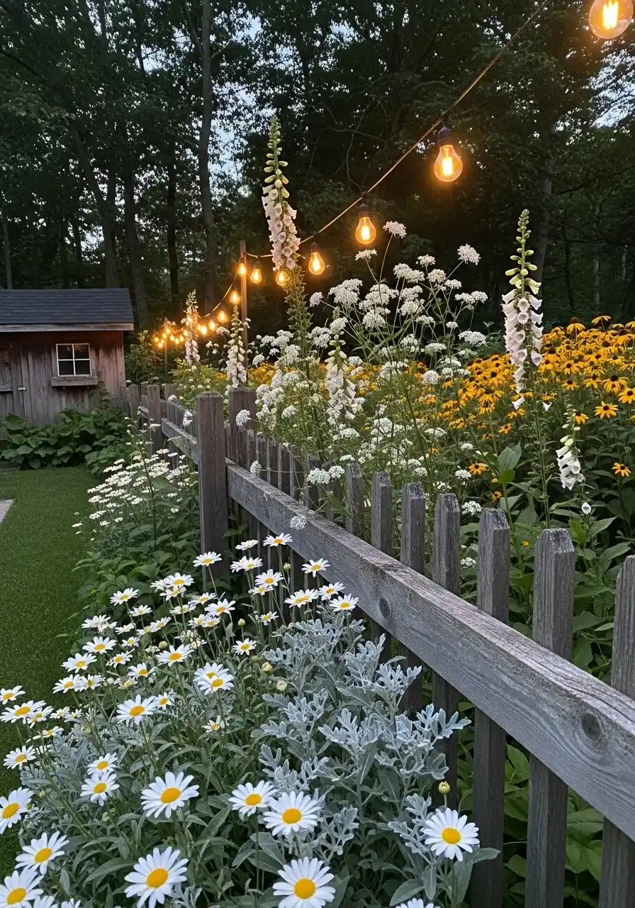 Plant-wise, go for soft whites and yellows mixed with some taller “wand” flowers, like yarrow or airy stuff that catches light. I’d add daisies in front because they glow at dusk, and then mix in foxglove-style spikes for drama. Keep the border slightly looser and more natural here, because a rustic fence looks weird with a super strict, perfect row. My little confession: I used to hate solar lights. Then I tried them in a fence border and suddenly I was outside every night like a moth.