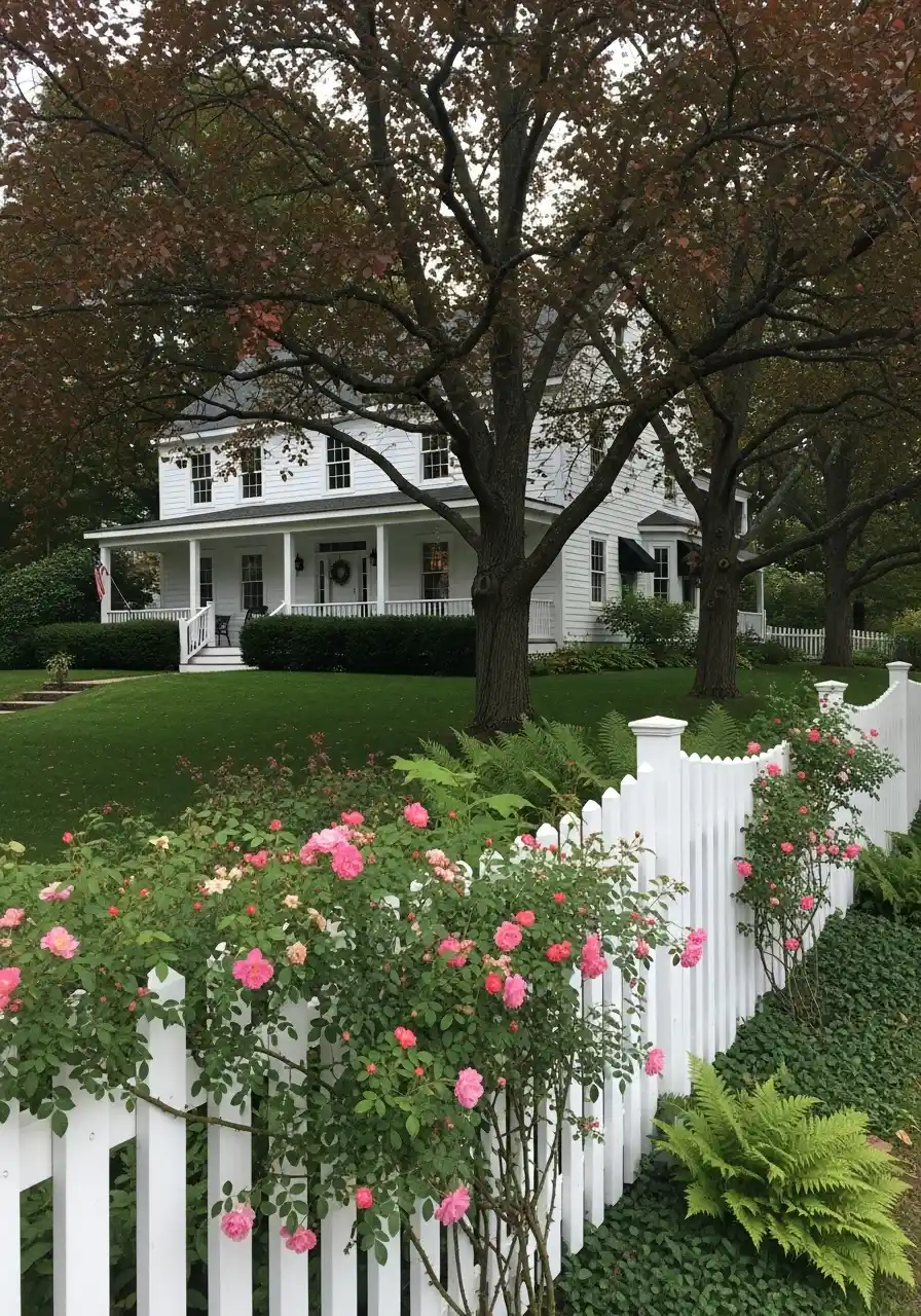 This hydrangea scene in front of the white house is unreal. The colors are like candy, pink, blue, lime-green blooms, all packed in. And the white picket fence around it makes it look like a postcard. It’s a bold look, but it still feels clean because the shape is simple.