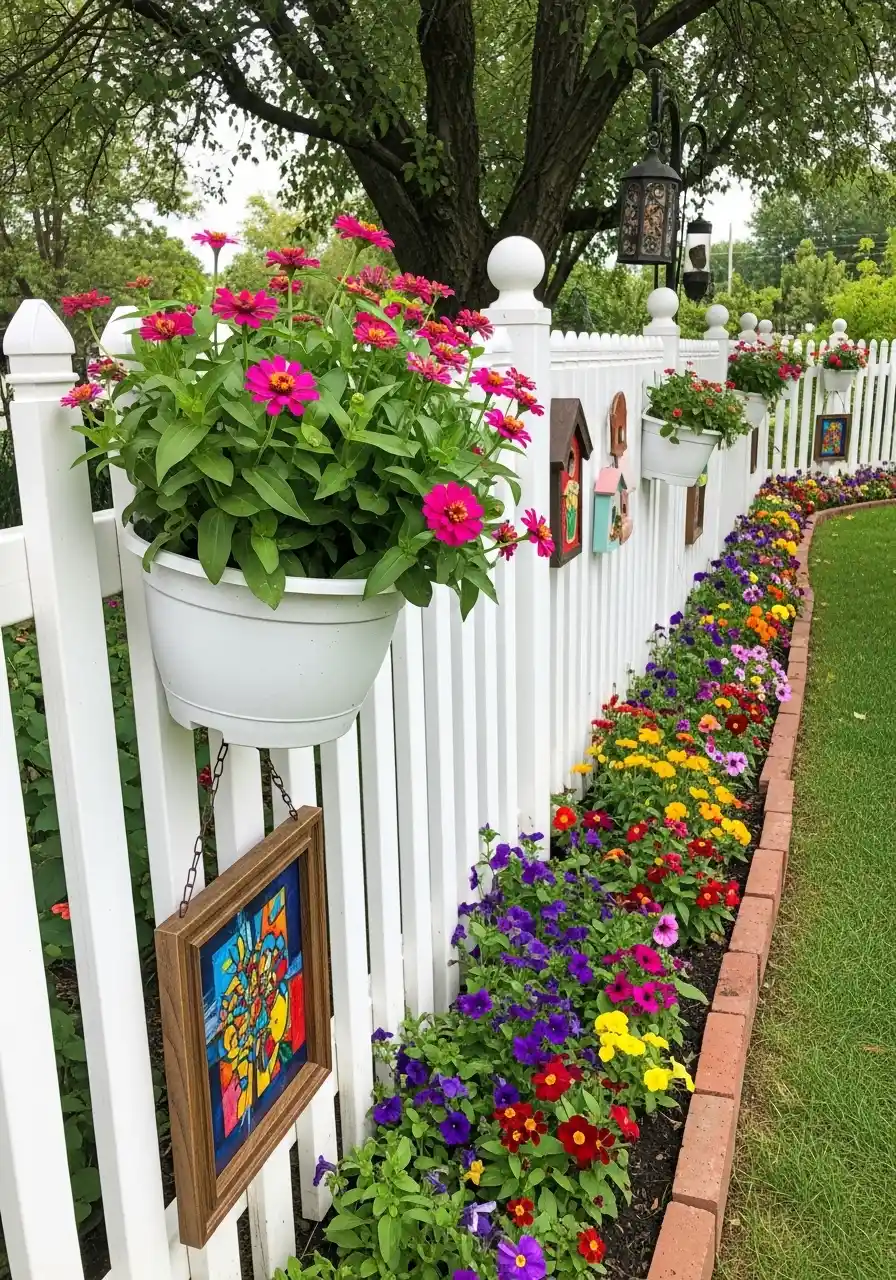 This one is loud in the best way. A long white fence plus hanging baskets is basically a parade. It screams, “yes I planned this,” even if you didn’t. If you want garden border fence ideas for a wide open yard, this is a power move because it adds color at eye level and at ground level.