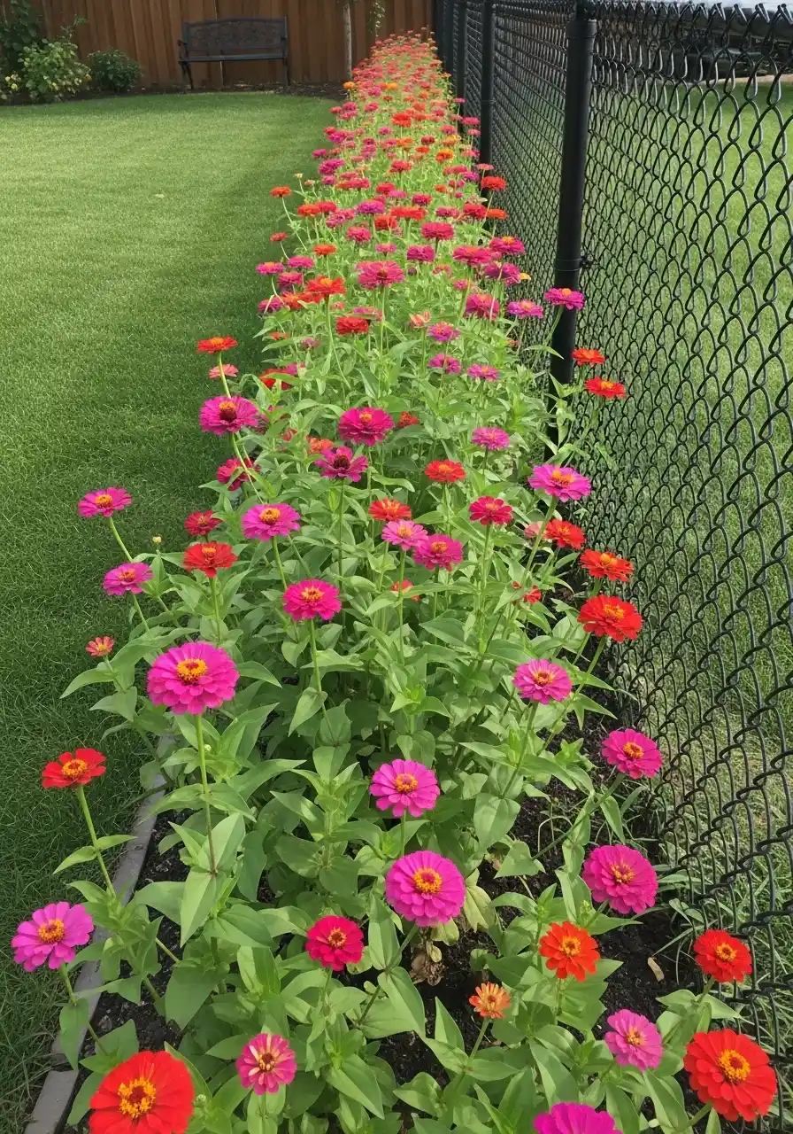 If you want garden border fence ideas for curb appeal, this is a solid one. Use one main flower, planted in thick rows. Zinnias are perfect because they bloom nonstop and come in tons of colors. You can also do begonias or impatiens if the spot is shady.