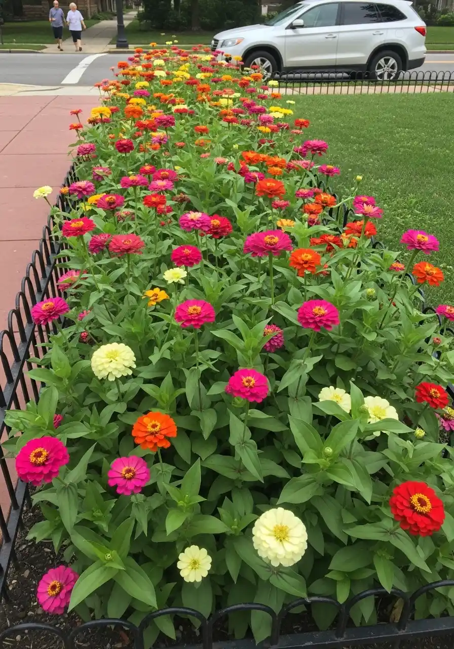 This sidewalk border is basically a living fence made of flowers. The zinnias are packed in so tight they look like a colorful blanket. The white fence posts behind them keep the line straight and clean, and the sidewalk edge makes the color pop even more.