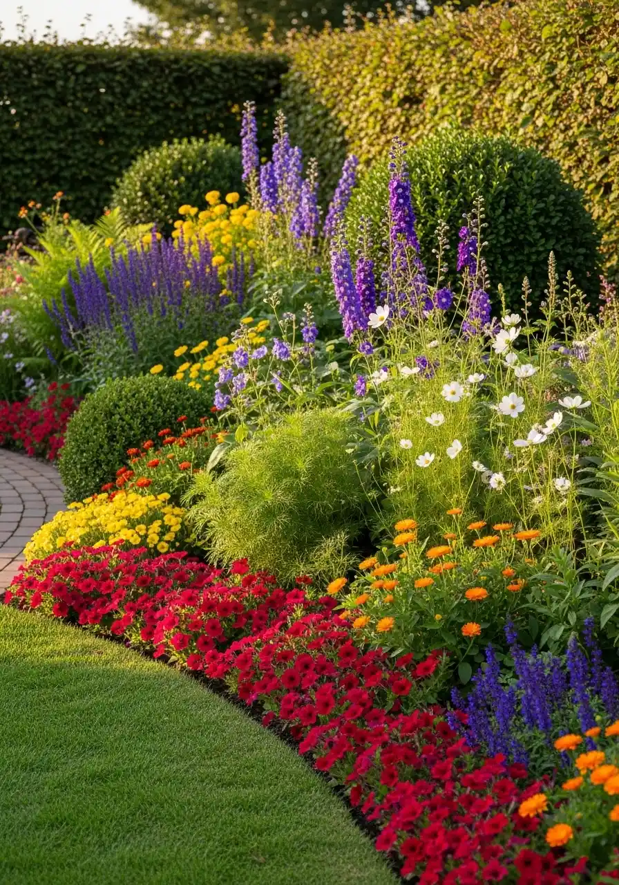 If you want this look, start with the border “bones” first. Pick one evergreen shape you’ll repeat (round boxwood balls or low boxwood edging), then add a second evergreen shape for height (tall cones, or upright shrubs). After that, slip in flowering plants in one main color and one accent color. The trick is repetition. Same plant, same spacing, over and over. It’s one of those garden border plant ideas that looks expensive even if you’re not spending wild money.